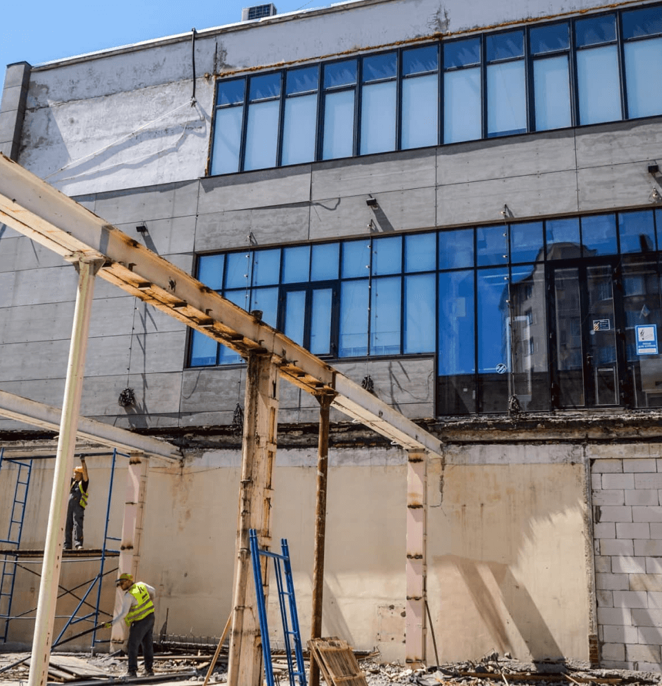 При демонтажі монолітного бетону є можливість спеціальною технікою подрібнити його до фракції щебеню. Так на Промприладі демонтовані бетонні стяжки було подрібнено і перевикористано для створення нижнього шару силової підлоги.
