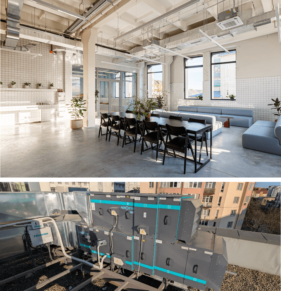 Команда відділу будівництва встановлює мультизональні VRV-системи кондиціювання, що дозволять створити комфортний мікроклімат в окремих приміщеннях будівлі. Йдеться про утеплені фасади та енергоефективні вікна, що мають срібне напилення, заповнене аргоном. Воно надає ефект «теплового дзеркала», при якому тепло відбивається в приміщення, а не назовні.
